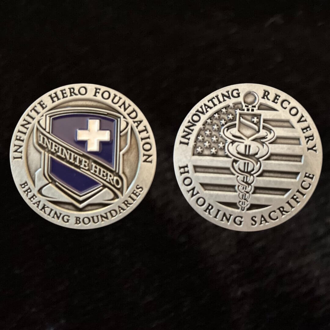 Join us as a monthly donor this November — in honor of National Veterans and Military Families Month — and receive this limited-edition challenge coin as our gift of gratitude. Your ongoing support fuels Infinite Hero’s work to break barriers, advance healing, and innovate recovery for wounded veterans and their families.